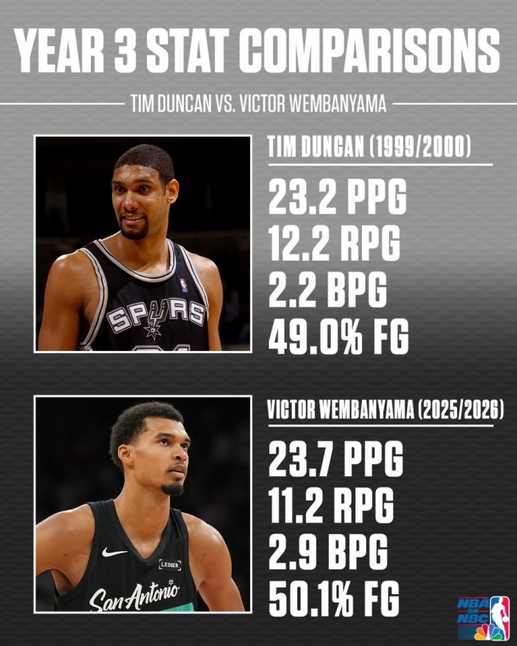 文班&邓肯生涯第3年数据对比!邓肯23+12+2 文班23+11+3